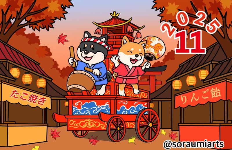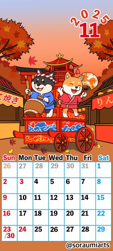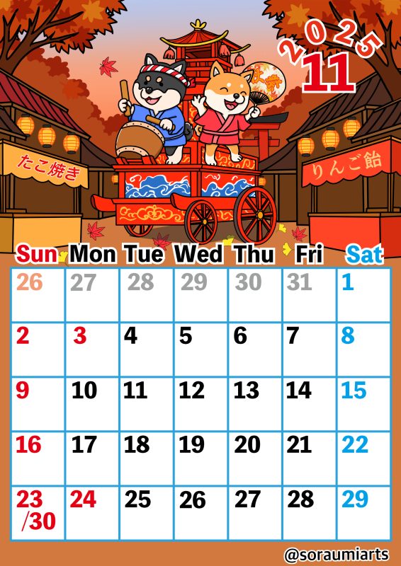 【無料配布】2025年11月そらうみカレンダー カレンダー 2025.10.29 スポンサーリンク 2025年11月のそらうみカレンダーを無料配布していますので、使ってもらえると嬉しいです。 目次 イラスト「秋祭り」2025年11月のそらうみカレンダースマホロック画面用印刷用(A4、A5) イラスト「秋祭り」 山車の上でそらうみが秋祭りを盛り上げます。 2025年11月のそらうみカレンダー スマホロック画面用 印刷用(A4、A5) イラスト、漫画へ戻る